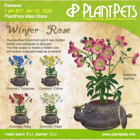 On the 23rd of January, we are releasing brand new species Winter Rose! There are 10 common ones, 1 seasonal and 5 rare winter rose plantpets. We will be selling only four of the common ones and also the seasonal one. Any of the 16 winter roses can come as a seed of any other winter rose. The first avatar to collect a seed of a hidden one will receive a second seed as a reward! You can monitor which winter roses have been discovered at https://plantpets.dejapi.com/?q=discoverers.