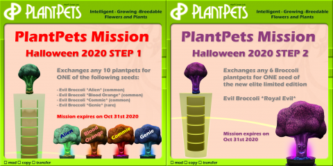 The three common and the rare one can be obtained with a mission that exchanges any 10 growing plantpets for asingle seed of the choice of the player. The limited edition is much harder to obtain. It is obtainable ONLY through a mission that exchanges 6 growing broccoli plantpets for one seed of the limited edition *Royal Evil*. Both missions are available in the PlantPets Main Store for 12L each. With the current price of seeds on the SL Marketplace, we are estimating that an avatar can collect all five new broccoli plantpets with less than 2000 lindens in total and typically much less.