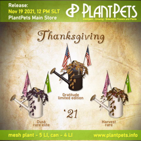 We released three new ivy plantpets for this Thanksgiving season: Ivy *Gratitude* which is a limited edition, Ivy *Dusk*, which is rare elite, and Ivy *Harvest* which is rare. They are available as mission rewards. The missions can be purchased in the PlantPets Main Store and must be completed by the end of November.