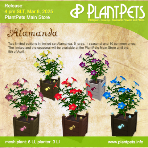 The Alamanda plantpets have been designed by our renowned breeder, Kizi Wonder. Each planter has been styled as a music box, with every Alamanda plantpet named after a particular genre or type of music. The note prim on each planter includes a script that can play any sound files placed in the note’s contents.